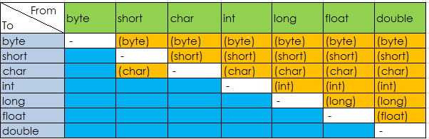 如果从小转换到大,那么可以直接转换,而从大到小,或char 和其他6种数据类型转换,则必须使用强制转换。